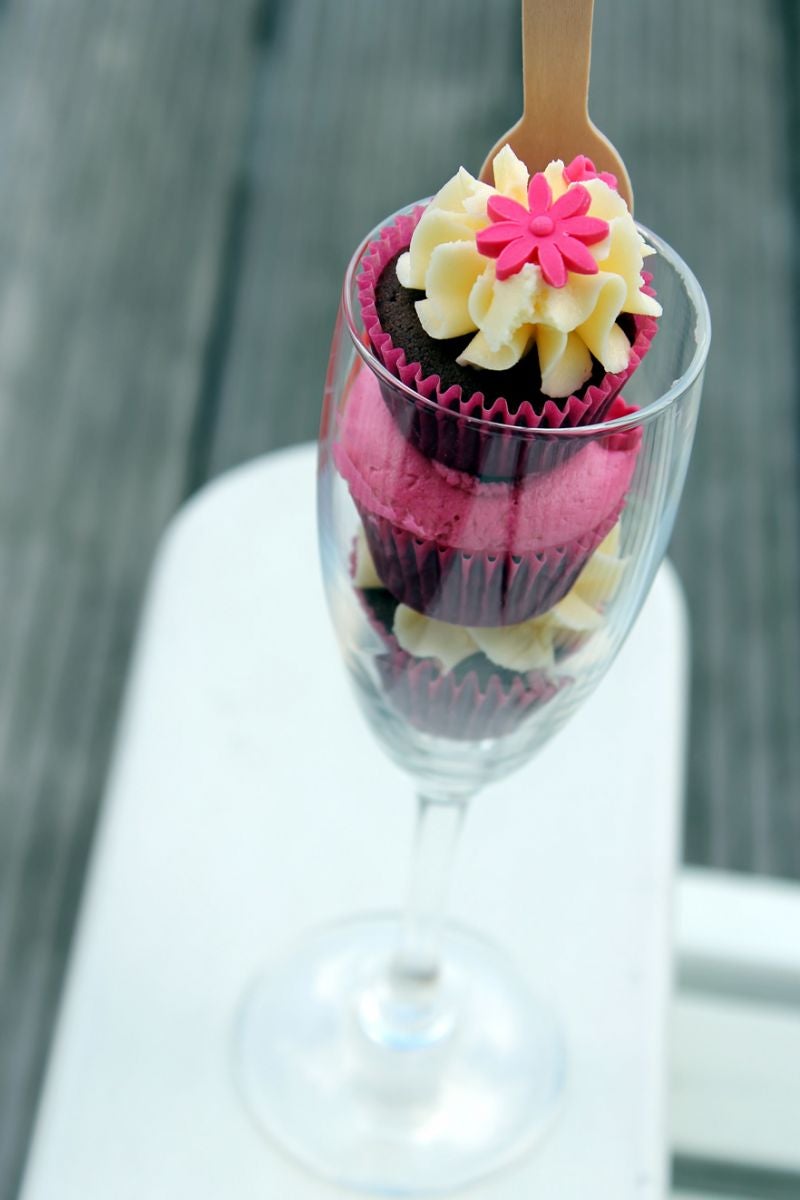Maak het basisrecept frosting, en voeg samen met de vanille de champagne toe. Voor een gekleurde frosting voeg je een drupje kleurstof toe en verdeel je de frosting over verschillende kommetjes. Vul een spuitzak met decoratietip met de frosting (gebruik meerdere spuitzakken als je werkt met verschillende kleuren frostings.) Zet een afgekoelde mini cupcake in het champagne glas en spuit een toefje frosing op de cupcake. Je kunt ook eerst de cupcakes decoreren en dan met een prikker ( steek deze voorzichtig in de cupcake) in het glas laten zakken. Maak eventueel bloempjes van fondant met een plunger als decoratie. Ga zo door tot het glas is gevuld.